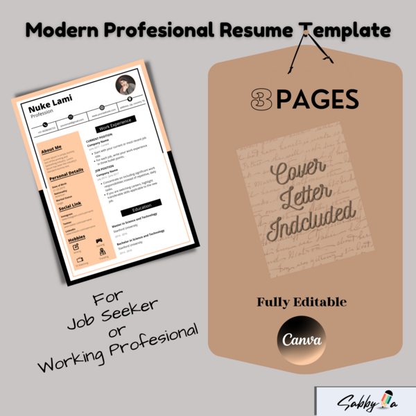 3 Page Resume Template with Cover Letter |Printable Modern Resume | Professional Resume Template Editable in Canva | CV Template for Job Seeker or Professionals