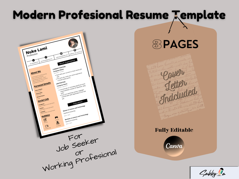 3 Page Resume Template with Cover Letter |Printable Modern Resume | Professional Resume Template Editable in Canva | CV Template for Job Seeker or Professionals
